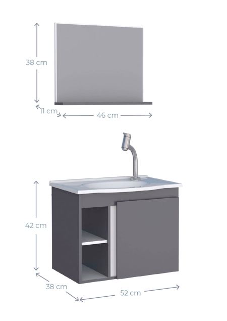 | Ancho | Mueble vanitorio: 52 cm | Áereo: 46 cm |